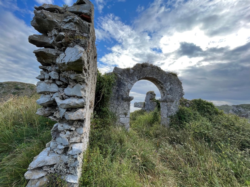 Josée : Ce matin, je suis allée à la plage avant de partir. J'ai suivi ensuite le sentier côtier et il y avait un tout petit bout de chemin sur la côte; je l'ai emprunté. Tout au bord de l'océan, j'ai vu une ruine sur un rocher. Il fallait s'éloigner un peu du sentier principal, mais on pouvait y accéder. J'y suis allée. C'était étonnant. Il y avait une petite plage de rochers à gauche et plein de gros rochers tout autour de ces ruines. Cela me fascinait. Je me suis demandé qui avait bien pu vivre dans cette maison. J'étais attirée par cet endroit, J'avais de la difficulté à me résoudre à le quitter.
